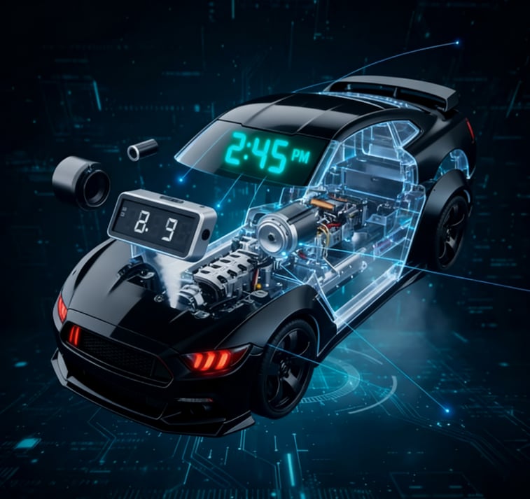 Digital Windshield Display: The current time is crisply displayed in a glowing blue LED format right through the rear window/windshield, keeping the car's silhouette sleek and uninterrupted.